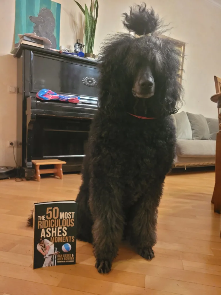 Chess grandmaster and commentator, Peter Svidler, submitted this really quite magnificent photo of a black standard poodle being conspicuously indifferent to The 50 Most Ridiculous Ashes Moments, the cricket book we wrote with Dan Liebke.